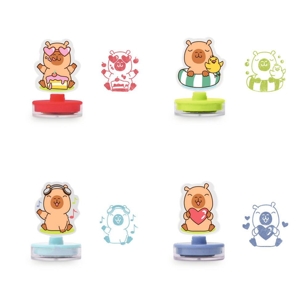Estos simpáticos sellos con tapa de acrílico son perfectos para crear diseños creativos, manualidades y decoraciones. Gracias al tampón autoentintable integrado y a la tapa reutilizable, este sello te hará disfrutar durante mucho tiempo. Envasado individualmente en plástico retractilado. Disponible en 4 motivos y colores: turquesa, rojo, azul y verde.