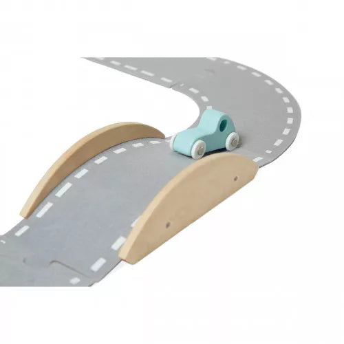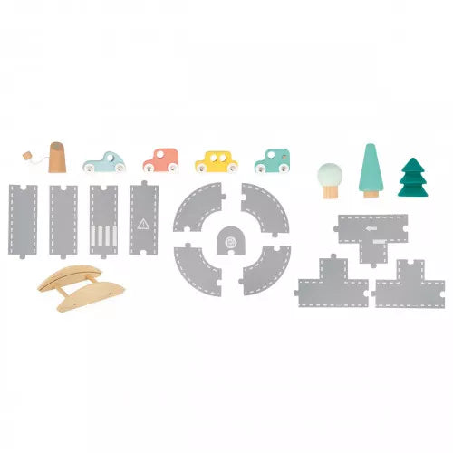 ¡Este es un circuito de coches sin igual! ¡Qué bonitas son las 12 piezas de fieltro que forman la carretera! Este circuito, fácil de montar para niños a partir de 2 años, está lleno de sorpresas: además de la suavidad y ligereza de sus piezas de tela, tiene un elemento elevado que hace las veces de puente, un vehículo «eléctrico» que se enchufa al terminal de carga con un imán y unos bonitos árboles de madera para decorar la pista para vehículos. ¡Para divertirse una y otra vez, se pueden hacer varios circuitos! Eso sí: ¡siempre haciendo que los 4 automóviles de colores del circuito cumplan las normas de tráfico!