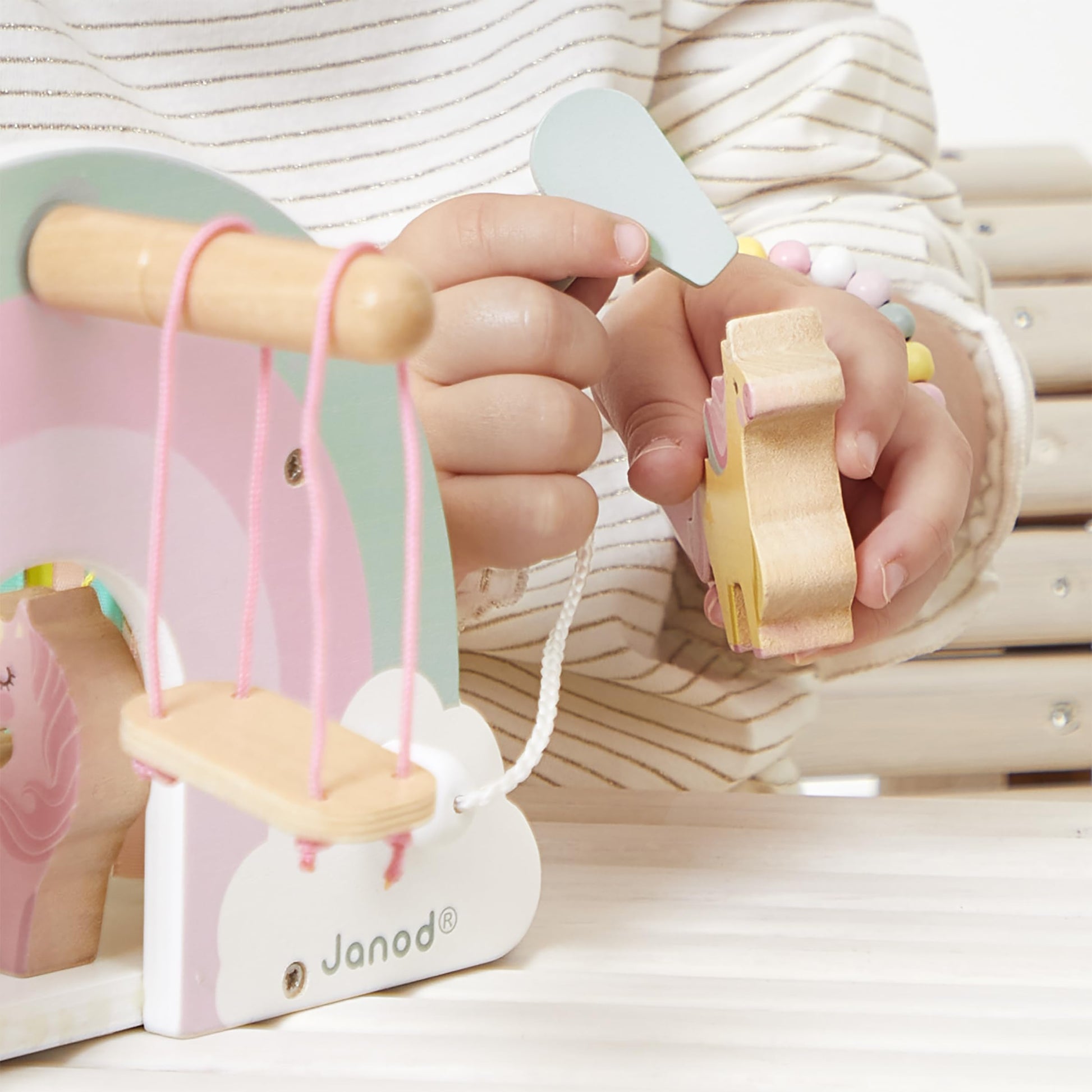 ¡Bienvenido a la casa del unicornio! En forma de arco iris, esta casa de madera es el escenario perfecto para fabulosas historias para niños a partir de 18 meses. Con 4 figuras de unicornio y 2 accesorios de madera, esta casa mágica estimula la imaginación de los más pequeños. ¡No espere más para descubrir todas las sorpresas de las que podrán disfrutar! En primer lugar, los unicornios podrán divertirse deslizándose por el tobogán una y otra vez. También hay un bonito columpio en el que podrán balancearse cada vez más alto hasta llegar a las nubes. Por último, pero no por ello menos importante, después de pasar un día estupendo haciendo el loco y compartiendo su magia, ¡a los unicornios les encanta que los mimen! Para ello, cepíllales la melena con el cepillo suministrado y sécales el pelo con el secador. ¡Y eso no es todo! Los unicornios pueden entrar en la casa por dos puertas laterales, e incluso pasar por debajo de una cascada de flecos de colores. Te desvelamos un secreto: incluso hay una puerta secreta con espejo... ¡Algo nos dice que los unicornios, y los niños, van a vivir locas aventuras en esta fabulosa casa! Manipulando los personajes de madera y las diferentes aberturas, los más pequeños podrán desarrollar su motricidad mientras se divierten. En su formato de 30 x 17 x 13 cm, ¡esta casa de madera y sus personajes son de lo más original! El conjunto está fabricado con madera procedente de bosques gestionados de forma sostenible, con certificación FSC™. En Janod, los unicornios son inteligentes y utilizan la magia para guardar sus secretos. Impetuosos e icónicos, evolucionan en un universo poético de colores atemporales. Así que ¡deja que surja la magia!