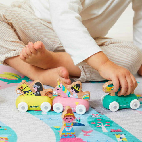 Este pequeño coche Janod forma parte de nuestra colección Cross Roads: una serie de alfombras de juego con circuitos, que resultan aún más divertidas cuando se complementan con nuestros juegos de cubos y pequeños vehículos de madera. El coche unicornio es especialmente adecuado para la alfombra de juego Reino Encantado, pero también combina bien con otras alfombras de la gama.