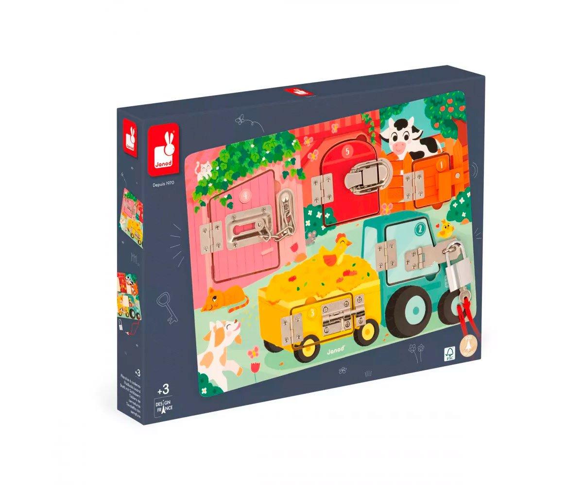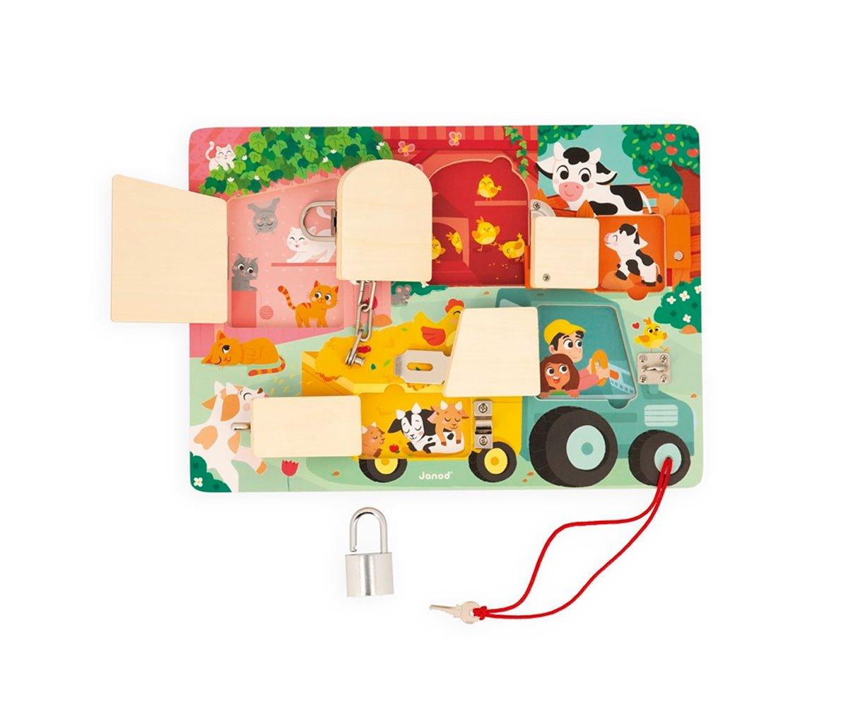 Cerraduras, cerrojos, llaves… ¡a los niños les encantan! ¡Así que disfrutarán un montón descubriendo, pensando y experimentando con los animales de la granja en su propio tablero de cerraduras! Para descubrir todos los secretos de este bonito busy board de madera, habrá que conseguir abrir las cinco puertas cerradas con cinco sistemas distintos: ¡llave, pestillo, cadena de seguridad, cierre de palanca y cerrojo! Cada puerta tiene su propio color y su propio número, ¡que se corresponde con el número de crías de animales que se esconden tras la puerta! ¡Un montón de formas distintas de divertirse! Aprender los colores, los números, conocer a los animales de la granja y sus bebés y ejercitar la destreza y la lógica. Esta preciosa tabla de actividades educativa de madera FSC® es ideal a partir de 3 años.