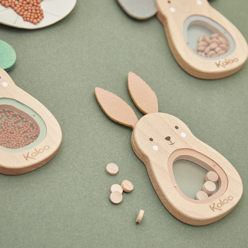 Tres preciosos sonajeros de madera de haya tienen cada uno distintos sonidos que descubrir y vienen en un bonito display. Cada sonajero tiene una cabeza de animal con orejas de fieltro y lleva en la tripa distintos elementos que, al sacudirlo, producen variados sonidos.