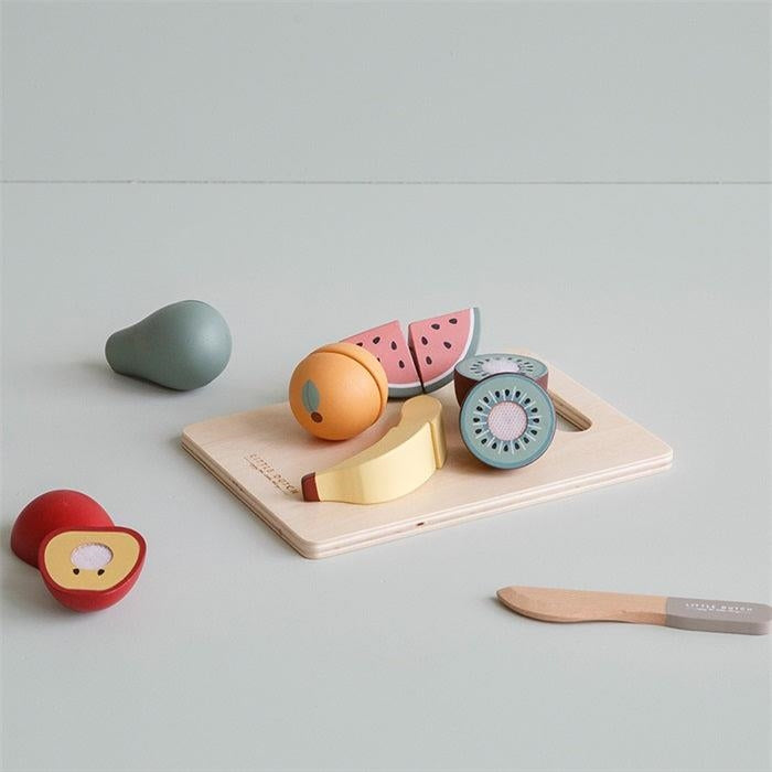 Set de 6 frutas cortadas, cuchillo y tabla de madera, de Little Dutch.