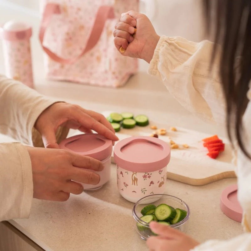 Cada recipiente es hermético y a prueba de fugas, por lo que puedes guardar fruta, frutos secos, yogur o cualquier snack sin preocuparte por derrames. Además, son aptos para microondas y congelador, lo que facilita aún más su uso diario. El diseño Forest Friends, con tiernos animalitos del bosque, añade un toque natural y dulce que encantará a los peques.
