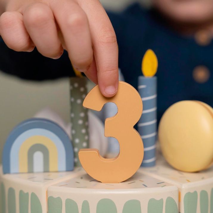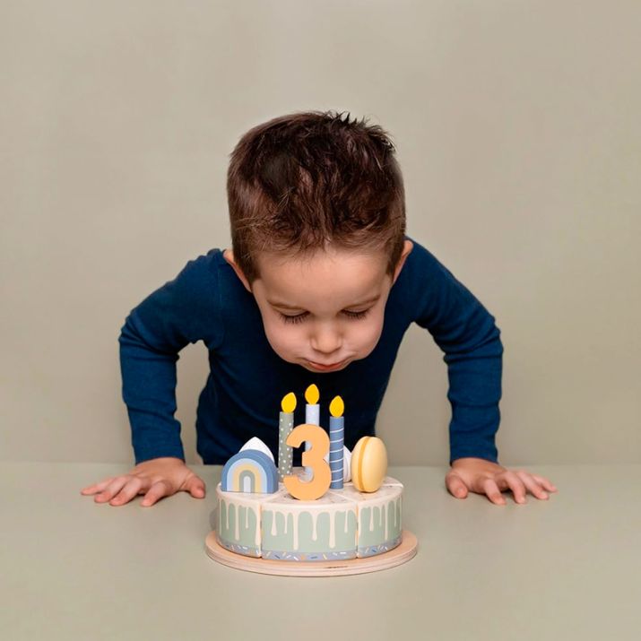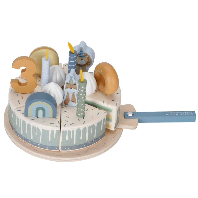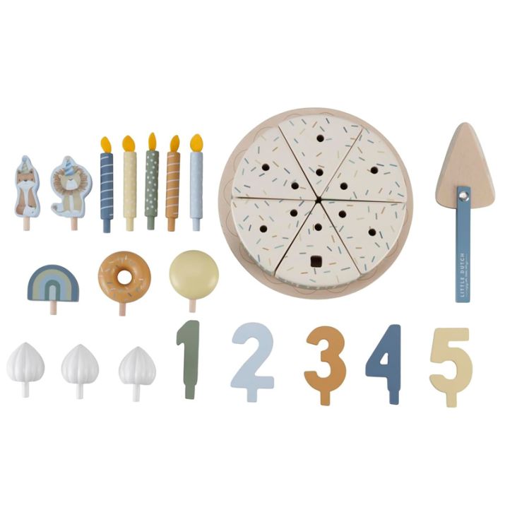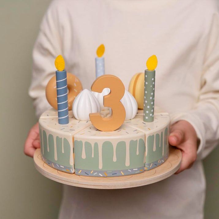 Tarta de cumpleaños de madera, con 6 porciones que se unen con velcro y accesorios decorativos, de Little Dutch.