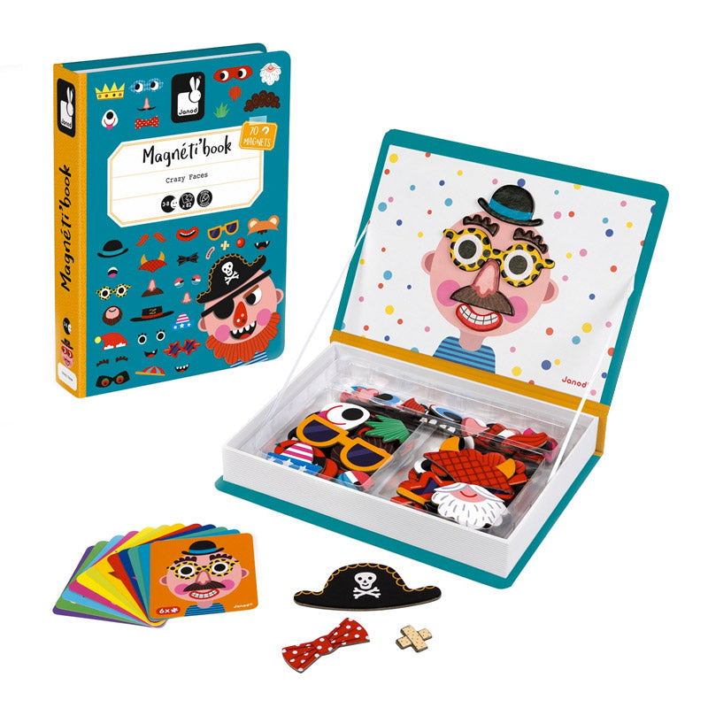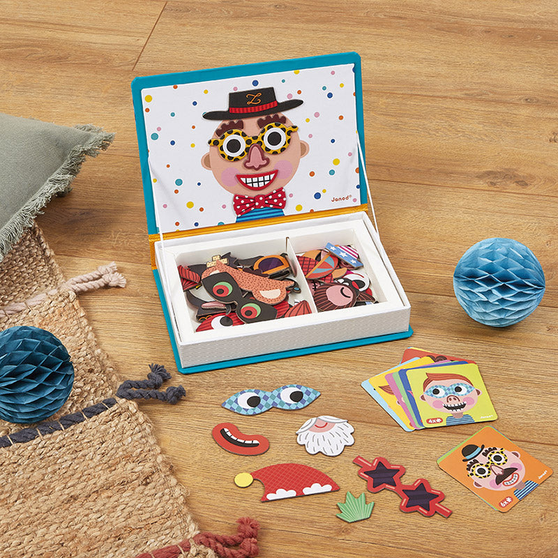 Descubre los Magnéti'books: unos juegos educativos y divertidos, fáciles de manipular y llevar a todas partes para niños a partir de 3 años. El principio es sencillo: crear divertidas caras o personajes basándose en alguno de los modelos que se incluyen o dando rienda suelta a su imaginación. Un sombrero, unas gafas… con los 70 imanes y las 12 tarjetas de ejemplo incluidas, ¡todas las combinaciones son posibles! Una vez abierto el libro, el niño pone en el lado magnético los imanes, que se quedan en su sitio: perfecto para largos trayectos en coche o para esperas que se alargan. Los Magnéti'books tienen un ingenioso formato que permite transportarlos fácilmente y guardarlos en una biblioteca como un libro. Hay muchos modelos disponibles: ¿qué tema añadirás a tu colección! Este producto está hecho de material certificado FSC® y otro material controlado.