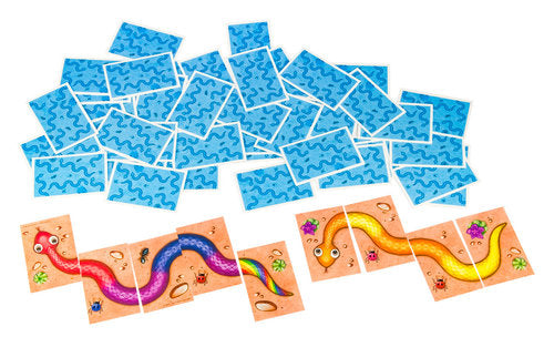 íLOS COLORES DE LA SERPIENTE ESTAN DESORDENADOS! ¿QUIEN PUEDE AYUDAR A PONERLOS EN ORDEN? ROJO CON ROJO, AZUL CON AZUL, AMARILLO CON AMARILLO... íES FACIL! ¿VERDAD? COMPLETAD LAS SERPIENTES CON CABEZA, CUERPO Y COLA Y LLEVAROSLAS A VUESTRO MONTON. íEL QUE CONSIGA MAS CARTAS AL FINAL DE LA PARTIDA ES EL GANADOR! UN SENCILLO Y VISTOSO JUEGO CON ASOCIACION DE COLORES, TIPO DOMINO, PARA EMPEZAR CON LOS JUEGOS DE REGLAS.