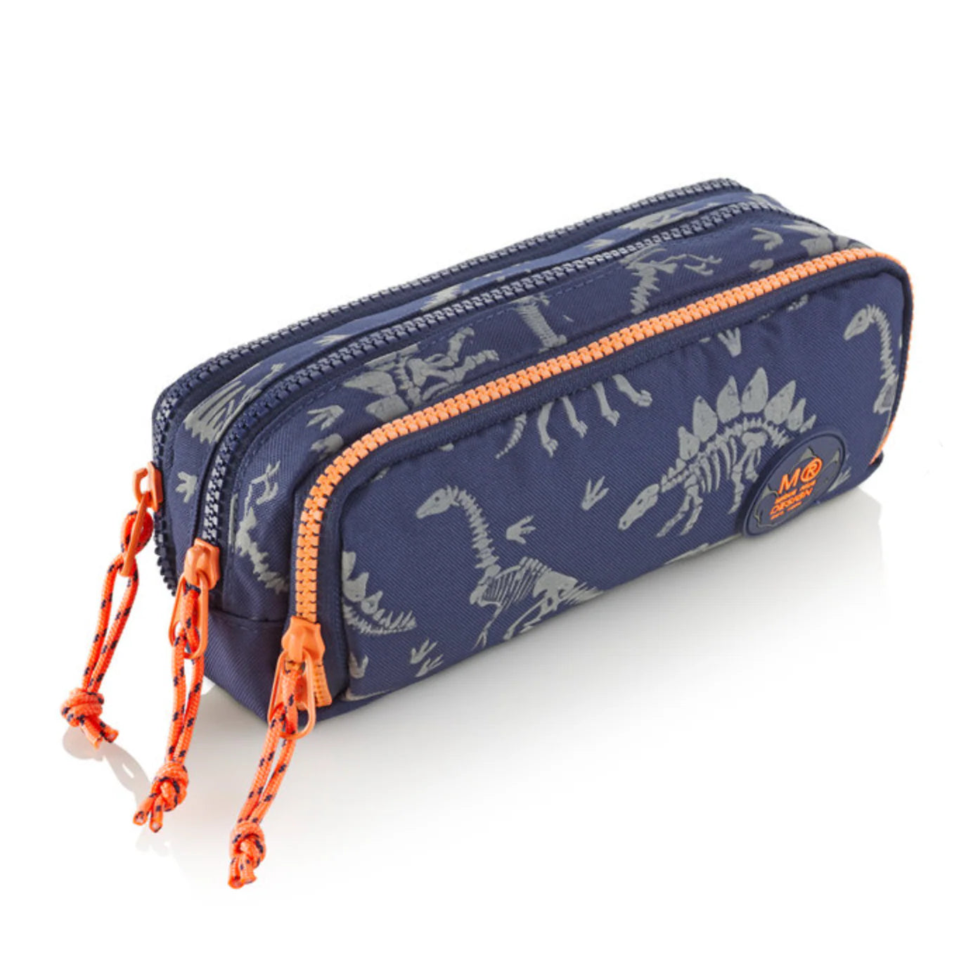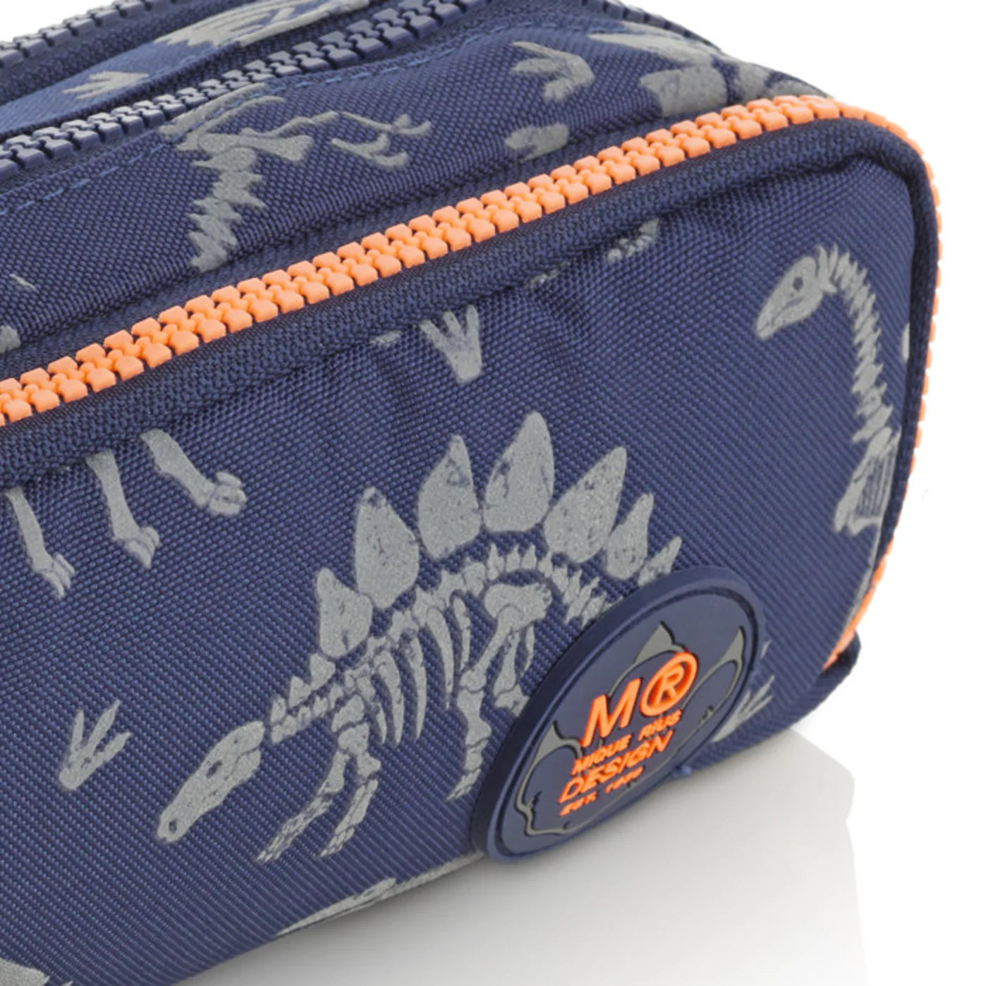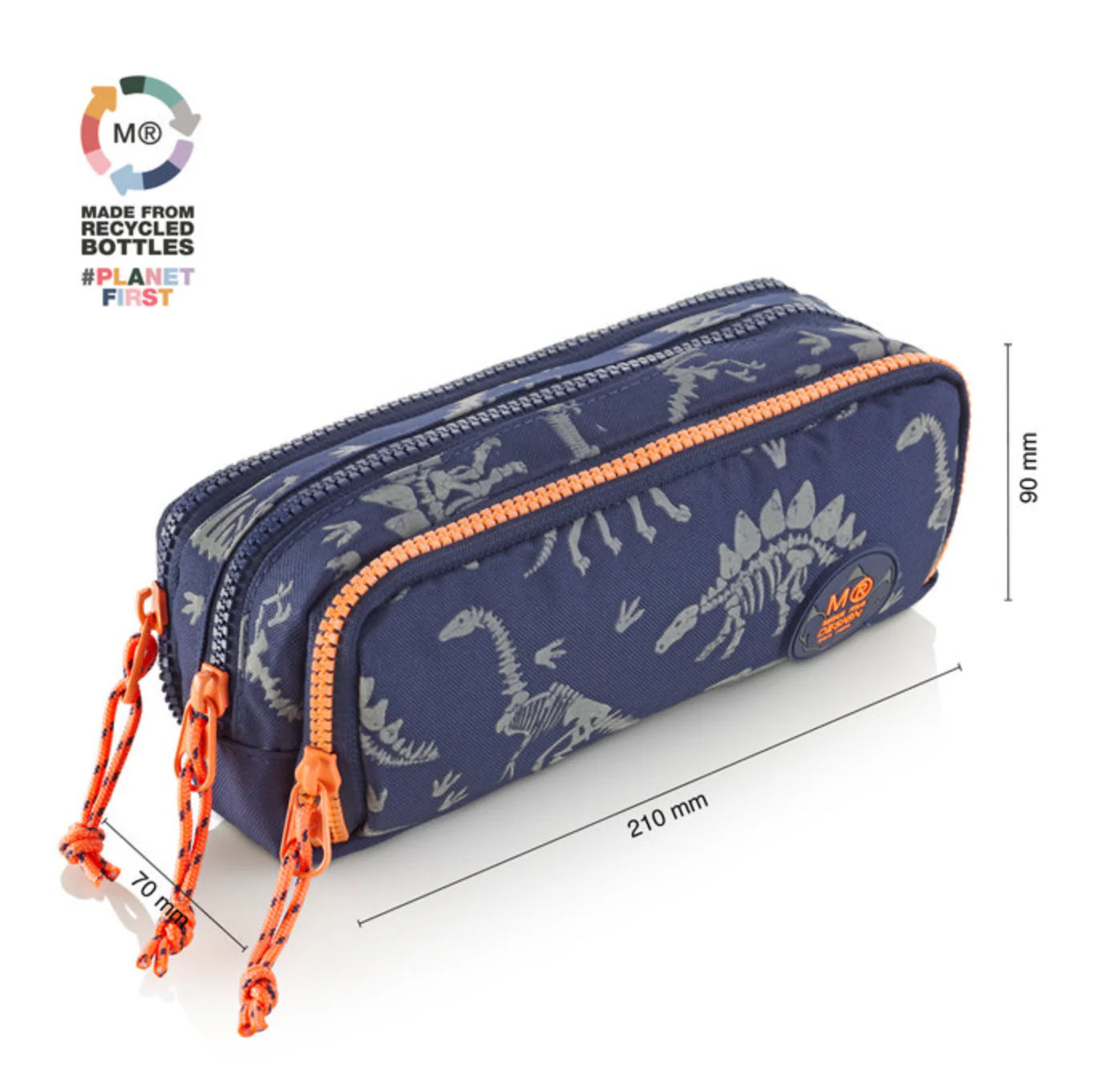 Portatodo con estampado de fósiles de dinosaurio que brillan en la oscuridad, ideal para fans. Composición exterior de RPET (poliéster reciclado), una elección ecológica para cuidar.Su triple cremallera permite clasificar y llevar ordenado.