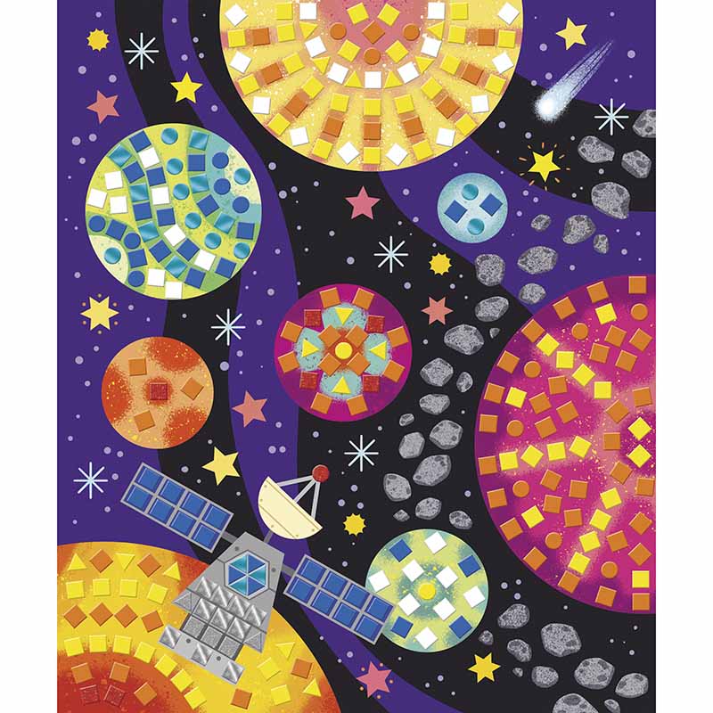 - El kit incluye 5 láminas ilustradas de la temática espacio, 1500 pegatinas de espuma y 1 manual con instrucciones.