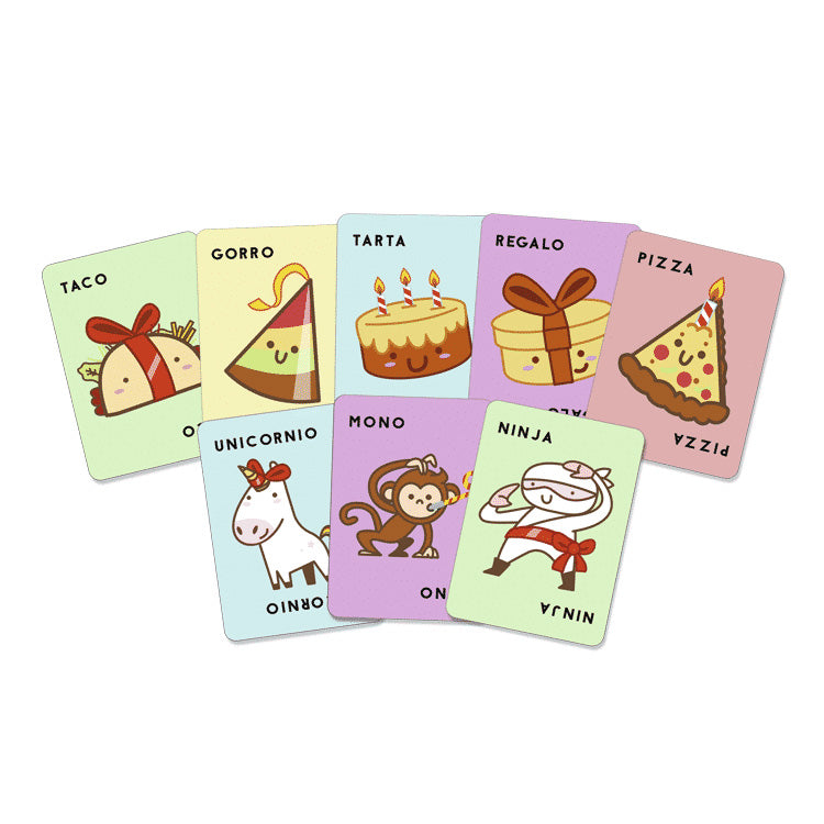 Por turnos, cada uno destapa la primera carta de su mazo y dice la palabra que corresponda: Taco, Gorro, Tarta, Regalo, Pizza.